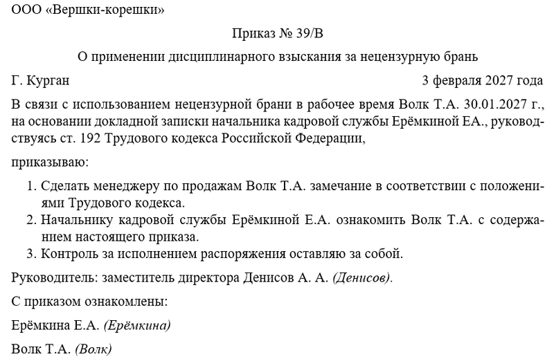 Скачать в КонсультантПлюсБесплатный доступ к документуОбразец приказа о применении дисциплинарного взыскания за нецензурную брань