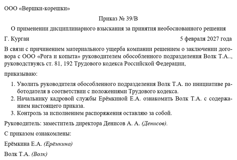 Приказ о применении дисциплинарного взыскания за необоснованное решение – это распорядительный документ, в соответствии с которым руководитель компании может наказать одного из своих заместителей за принятое им решение. Сегодня мы разберемся, что можно понимать под необоснованным решением на работе, какая ответственность может наступить за его принятие, причем здесь распоряжение руководителя и как правильно его оформить.
