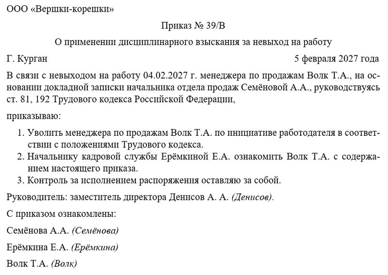 Скачать в КонсультантПлюсБесплатный доступ к документуОбразец приказа о применении дисциплинарного взыскания за невыход на работу