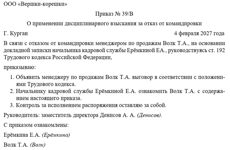 Скачать в КонсультантПлюсБесплатный доступ к документуОбразец приказа о применении дисциплинарного взыскания за отказ от командировки