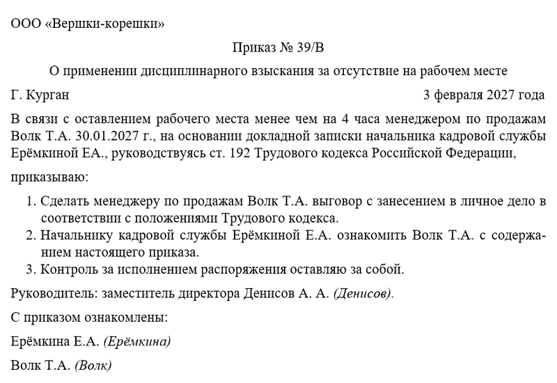 Скачать в КонсультантПлюсБесплатный доступ к документуОбразец приказа о применении дисциплинарного взыскания за отсутствие на рабочем месте