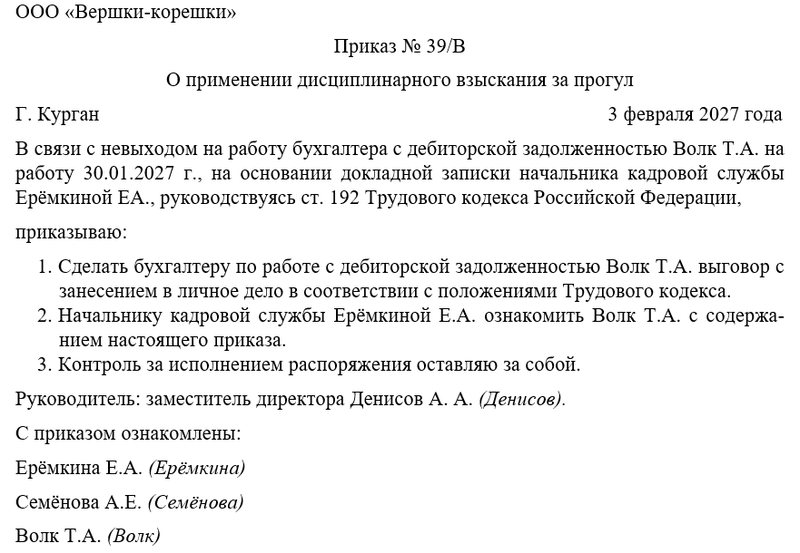 Бланк приказа о применении дисциплинарного взыскания за прогул