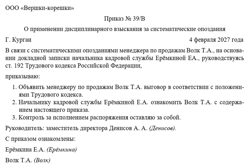 - кадровику ознакомить сотрудника с содержанием настоящего приказа, довести до информацию о последствиях;
