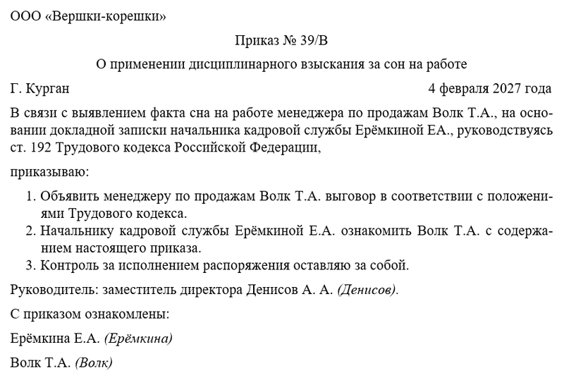 Приказ о применении дисциплинарного взыскания за сон на работе – это распорядительный документ, в соответствии с которым руководитель компании имеет возможность наказать своего подчинённого за то, что он позволяет себе спать на рабочем месте. Сегодня мы разберемся, насколько серьезным дисциплинарным проступком можно считать сон на работе, зачем нужен соответствующий приказ директора и как правильно его оформить.