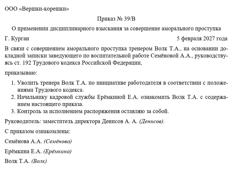 Скачать в КонсультантПлюсБесплатный доступ к документуОбразец приказа о применении дисциплинарного взыскания за совершение аморального проступка