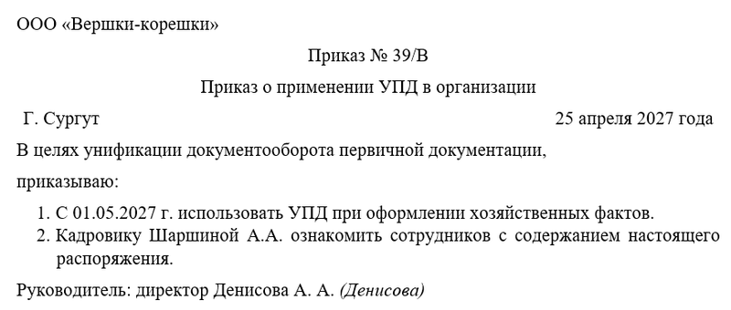 Следующим шагом руководитель объявляет о применении во внутреннем документооборота организации УПД как формы учетного документа. Также необходимо решить вопрос о том, кто их работников будет следить за исполнением распоряжения. Чаще всего контроль за исполнением распоряжения директор оставляет за собой.