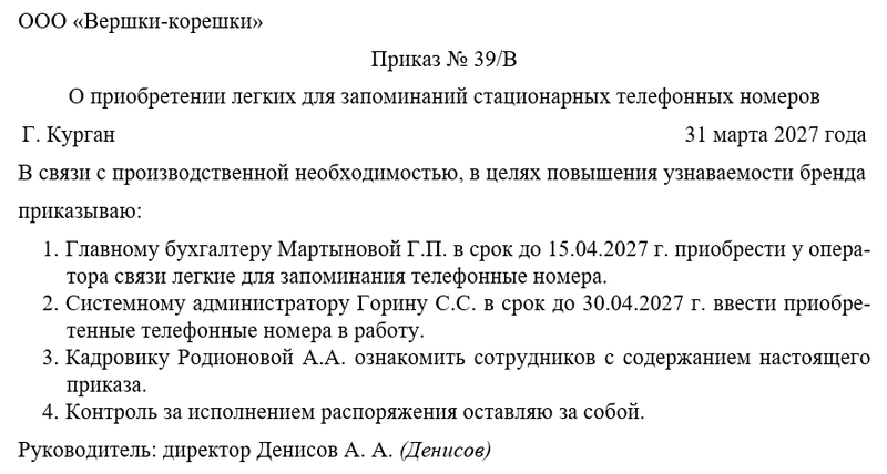Бланк приказа о приобретении легких для запоминания стационарных телефонных номеров