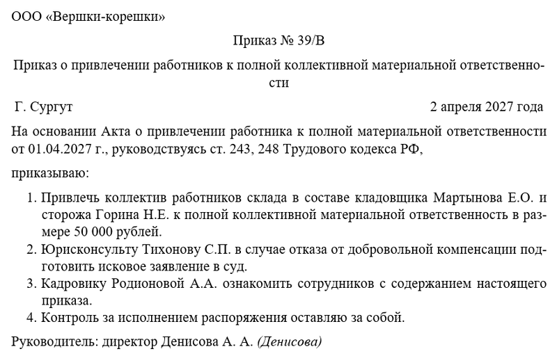 Следующим шагом руководитель объявляет о привлечении группы работников к полной коллективной материальной ответственности в соответствии с произошедшим инцидентом, составленным актом, а также указывает на человека, который будет осуществлять контроль. Чаще всего контроль за исполнением распоряжения директор оставляет за собой.