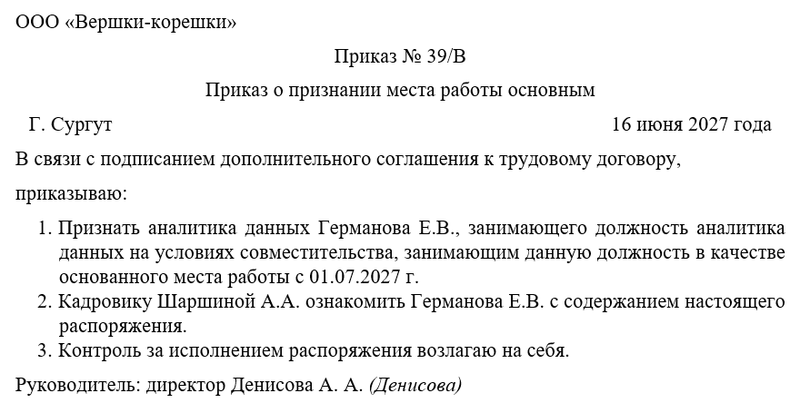 Приказ также определяет порядок взаимодействия с другими местами работы, если сотрудник оформлен по совместительству. Это особенно важно для правильного начисления налогов и страховых взносов.