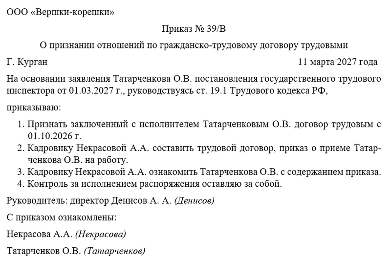 Бланк приказа о признании отношений по гражданско-правовому договору трудовыми