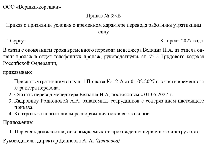 Следующим шагом руководитель объявляет о признании условия о временном характере перевода работника на другую работу утратившим силу, а также назначает человека, который будет осуществлять контроль. Чаще всего контроль за исполнением распоряжения директор оставляет за собой.