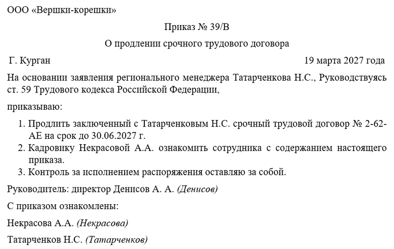 - продлить заключенный с таким-то сотрудников (укажем ФИО) трудовой договор (укажем его реквизиты) на определенный срок;