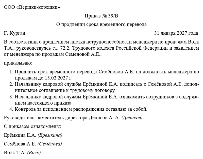 - продлить срок временного перевода сотрудника с одной должности на другую до такого-то числа;
