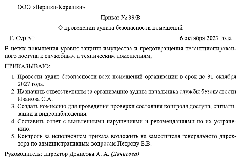 Приказ о проведении аудита безопасности помещений — это нормативный внутренний документ, направленный на установление единого порядка проверки состояния физической защиты корпоративных объектов и материальных ресурсов. Данный приказ регламентирует действия сотрудников, ответственных за безопасность, устанавливает обязанности, сроки проведения проверок, критерии оценки и порядок документирования выявленных нарушений. Основное назначение приказа заключается в создании системы, обеспечивающей предотвращение несанкционированного доступа, сохранность имущества, оборудования и конфиденциальной информации, а также повышение общей культуры безопасности в организации.