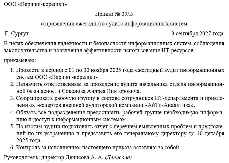 Таким образом, приказ о проведении ежегодного аудита информационных систем является важным инструментом внутреннего контроля, позволяющим компании не только выполнять требования законодательства, но и обеспечивать надежность, устойчивость и безопасность своей цифровой среды.