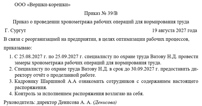 В распорядительной части приказа закрепляются назначение ответственных лиц, сроки проведения хронометража и порядок отчётности. Здесь же указывается перечень подразделений и операций, подлежащих исследованию. Дополнительно могут быть приложены инструкции по проведению наблюдений, формы фиксации данных и образцы отчётности. Завершается приказ подписью директора и отметкой о регистрации.