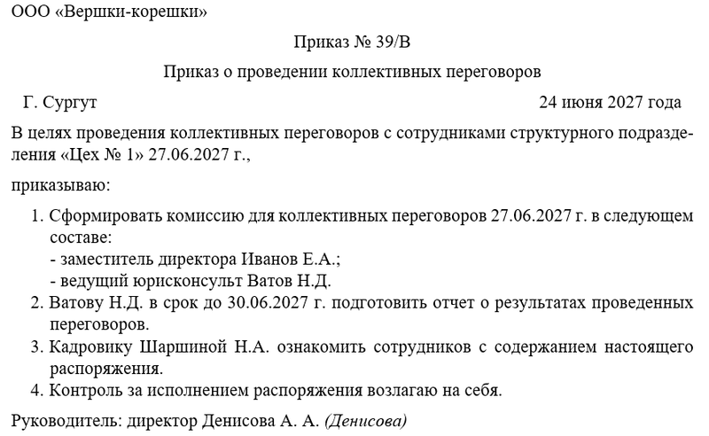Действие приказа прекращается после завершения переговорного процесса. Изменения в состав комиссии вносятся отдельным распоряжением. Контроль исполнения приказа возлагается на юридический отдел.