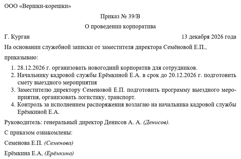 Говоря о форме распоряжения о проведении корпоратива, следует отметить, что по состоянию на сегодняшний день отечественный законодатель и вовсе не предлагает нам к применению каких-либо конкретных бланков или шаблонов, которыми можно было бы пользоваться при составлении официальной бумаги такого толка. Отсюда получается, что приказ в любом случае придется составлять самостоятельно и в свободной форме. Так, если до 2014 года Госкомстат и Минтруд еще пытались регулировать вопросы внутреннего документооборота частных организаций и муниципальных ведомств, то сейчас это всё отдано на самотёк. При разработке распоряжения ответственному лицу придется руководствоваться общими правилами делового документооборота.