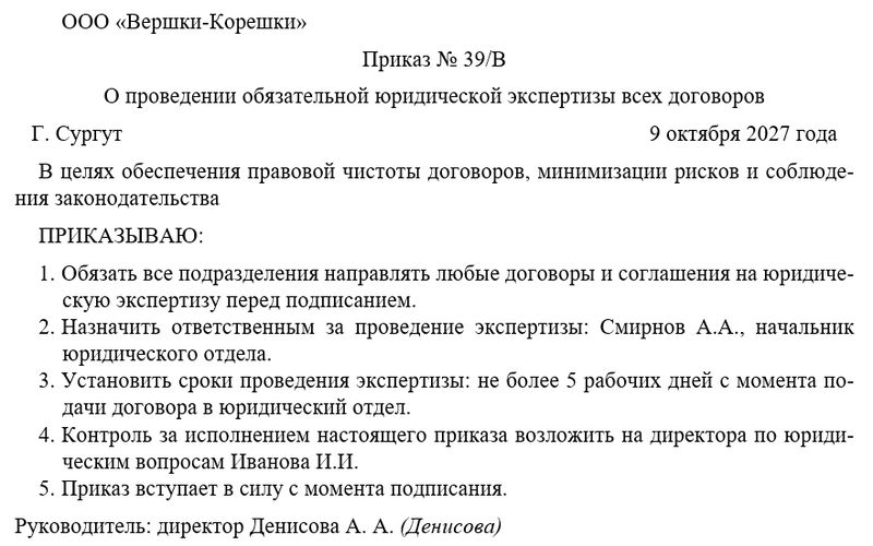 Бланк приказа о проведении обязательной юридической экспертизы всех договоров