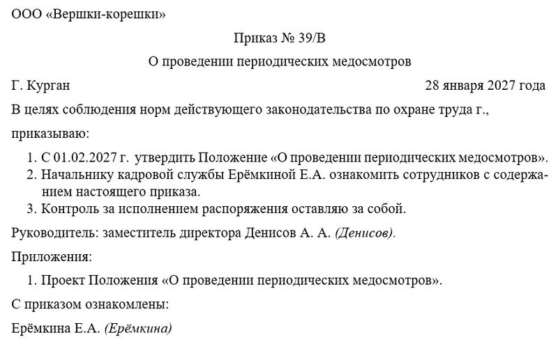 - с такого-то числа ввести в силу положение «О периодических медосмотрах»;