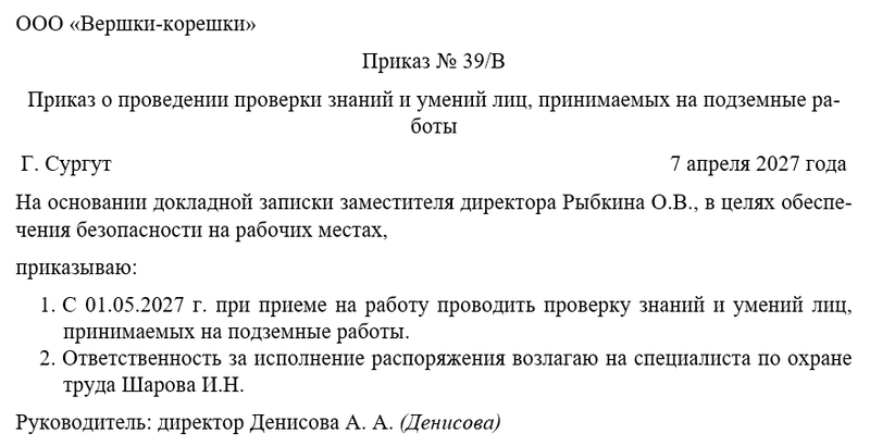 Следующим шагом руководитель объявляет о проведении проверки знаний и умений лиц, принимаемых на подземные работы, а также назначает человека, который будет осуществлять контроль. Чаще всего контроль за исполнением распоряжения директор оставляет за собой.