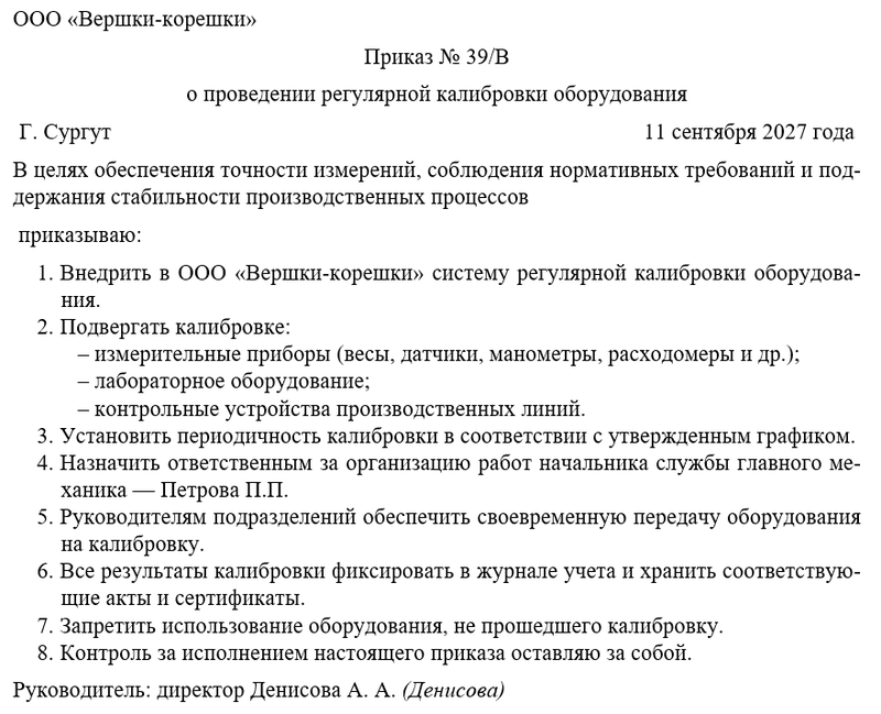 Приказ о проведении регулярной калибровки оборудования включает следующие ключевые элементы.