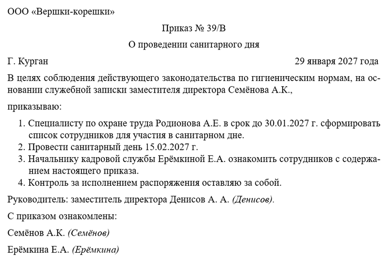 По структуре приказ о проведении санитарного дня должен состоять из шапки, описательно-мотивировочной части, а также определенного набора реквизитов. Каждый отдельно взятый структурный элемент имеет свои уникальные правила по части оформления, которые мы обсудим несколько позднее.