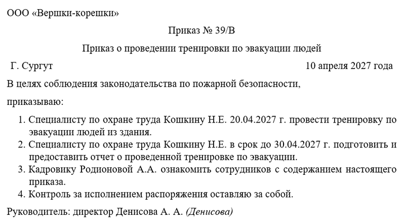 Следующим шагом руководитель объявляет о проведении тренировки по эвакуации людей из здания, а также назначает человека, который будет осуществлять контроль. Чаще всего контроль за исполнением распоряжения директор оставляет за собой.