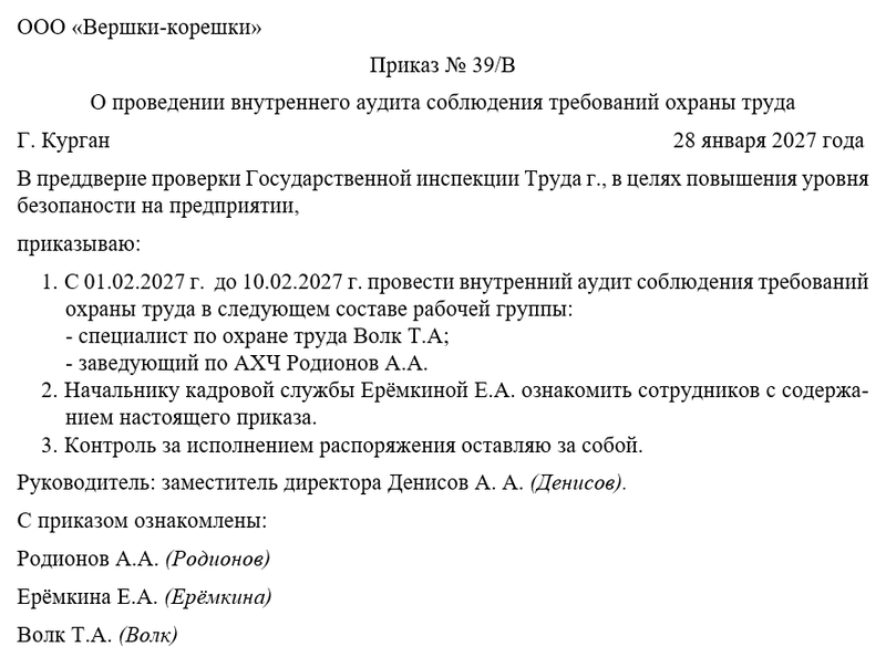 Скачать в КонсультантПлюсБесплатный доступ к документуОбразец приказа о проведении внутреннего аудита соблюдения требований охраны труда