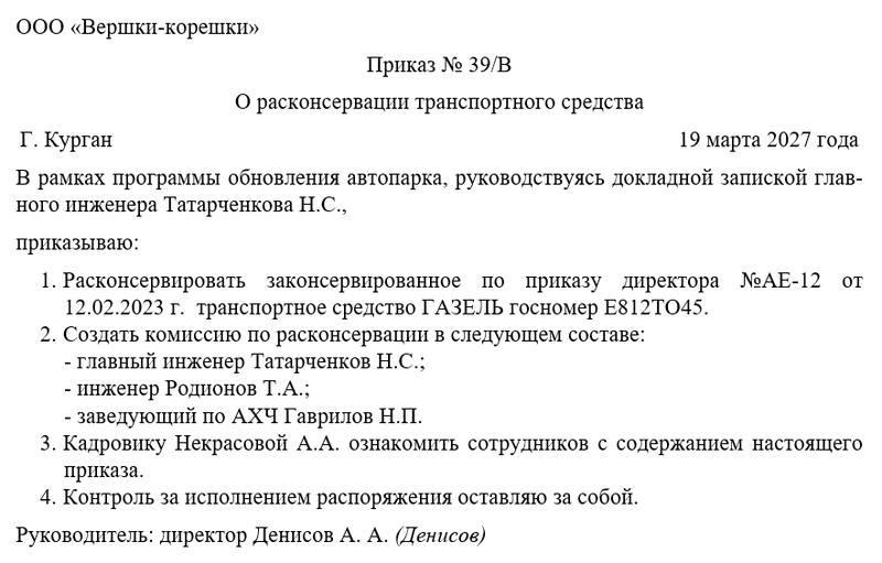 - расконсервировать законсервированное по приказу директора транспортное средство с таким-то государственным регистрационным номером;