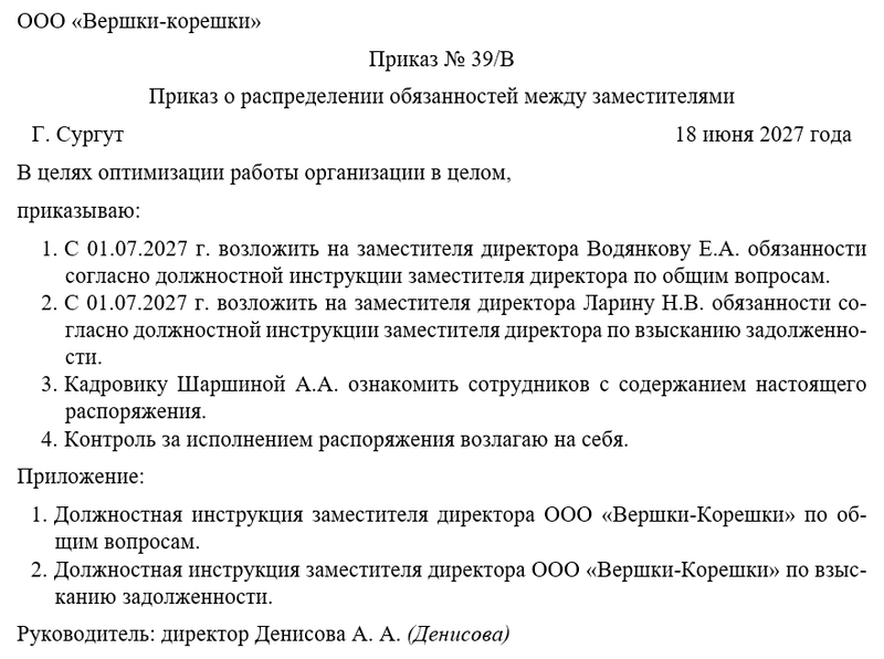Издание приказа устраняет правовую неопределенность, предотвращает возможные конфликты компетенций и является необходимым условием для привлечения заместителей к ответственности за неисполнение или ненадлежащее исполнение своих обязанностей. Приказ также служит базовым документом для последующего контроля со стороны директора и оценки эффективности работы каждого члена команды топ-менеджмента.