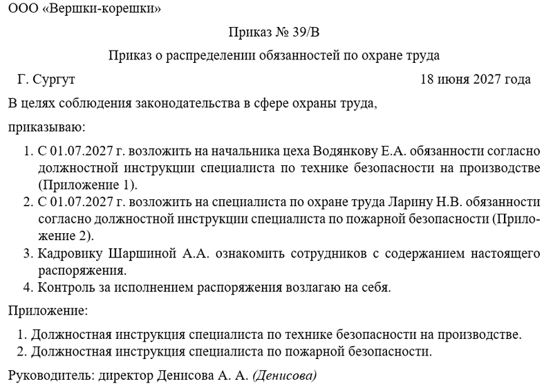 Приказ работодателя имеет первостепенную юридическую силу. Он официально назначает всех ответственных лиц. Документ обязателен для безусловного исполнения. Приказ исключает любую неясность в ответственности.
