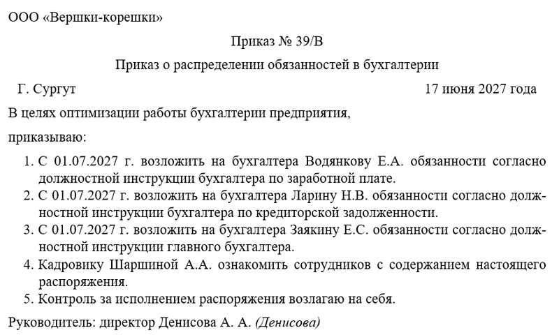 Для бухгалтеров, получающих дополнительные обязанности, указываются сроки введения изменений и размеры компенсационных выплат. Документ подписывается генеральным директором после согласования с главным бухгалтером. Все сотрудники бухгалтерии должны быть ознакомлены с приказом под роспись, при отказе составляется соответствующий акт.