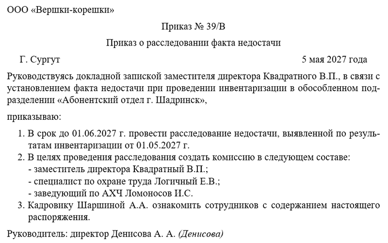 Следующим шагом руководитель объявляет о проведении расследования выявленного по результатам инвентаризации от такого-то числа факта недостачи. Ссылка на нормативную базу обязательна. Также необходимо решить вопрос о том, кто их работников будет следить за исполнением распоряжения. Чаще всего контроль за исполнением распоряжения директор оставляет за собой.