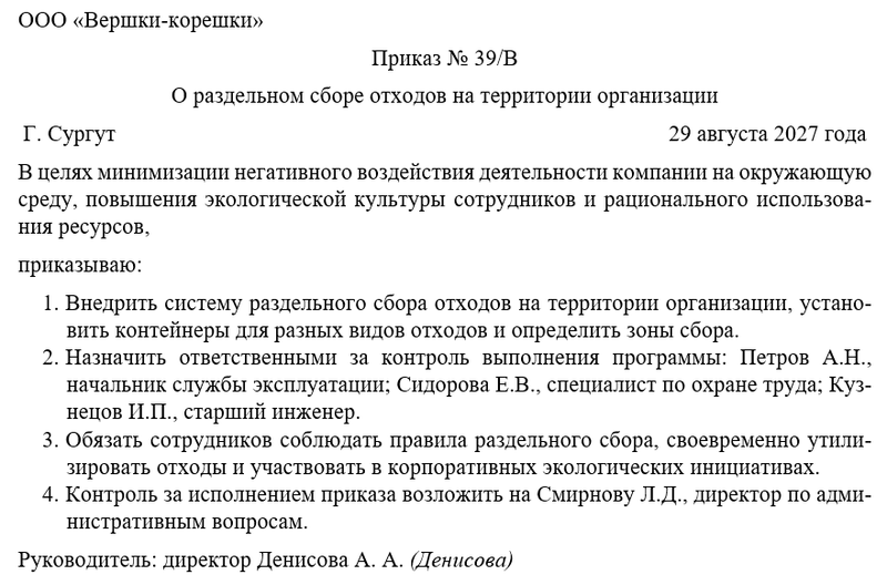 В распорядительной части перечисляются конкретные мероприятия, сроки исполнения, ответственные лица и подразделения, методы контроля и отчётности, порядок ознакомления сотрудников с приказом под роспись. При необходимости к приказу могут быть приложены инструкции, схемы расстановки контейнеров, графики сбора отходов и контрольные листы. Документ заверяется подписью руководителя, регистрируется в журнале приказов и доводится до сведения всех работников, что обеспечивает юридическую силу и обязательность исполнения.