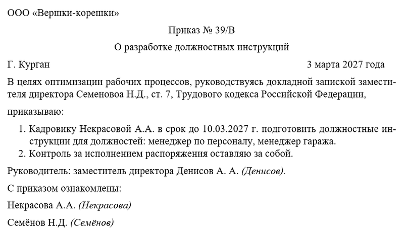 - возложить на такого-то сотрудника обязанность по разработке должностных инструкций;