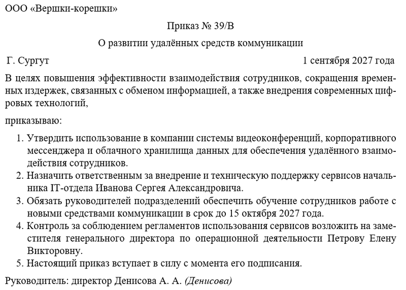 Основная цель документа заключается в формализации процесса перехода к новым стандартам делового взаимодействия, повышении эффективности коммуникаций и создании технологически комфортной среды для сотрудников. Приказ закрепляет необходимость внедрения видеоконференций, корпоративных мессенджеров, облачных сервисов и других решений, позволяющих организовать взаимодействие в режиме реального времени. Он формирует единое пространство коммуникаций, где исключается дублирование информации и обеспечивается прозрачность всех рабочих процессов.