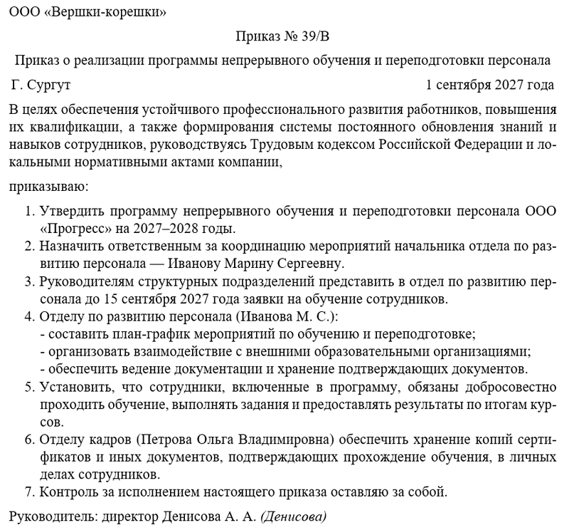 В приказе определяется перечень направлений, по которым будет проводиться обучение и переподготовка: повышение квалификации, освоение новых технологий, обучение цифровым инструментам, развитие управленческих и коммуникационных компетенций. Также указывается механизм подбора сотрудников для участия в программе — на основании планов подразделений, рекомендаций руководителей и результатов аттестаций. Важно, чтобы обучение охватывало как линейных специалистов, так и руководителей среднего и высшего звена.