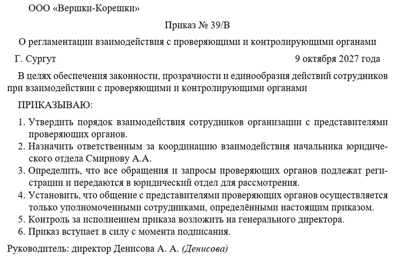 Настоящий приказ устанавливает порядок и правила взаимодействия сотрудников организации с проверяющими и контролирующими органами. Его принятие направлено на обеспечение правовой защищённости компании, недопущение нарушений при проведении проверок и формирование единого подхода к общению с представителями государственных и муниципальных структур.