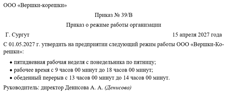 Следующим шагом руководитель объявляет об утверждении с такого-то числа определенного режима работы организации, а также назначает человека, который будет осуществлять контроль. Чаще всего контроль за исполнением распоряжения директор оставляет за собой.