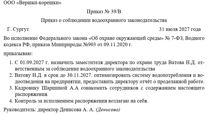 Приказ является основным внутренним документом, формализующим обязанности сотрудников по соблюдению водоохранного законодательства. Он доводит требования закона до конкретных исполнителей, определяет зоны ответственности и порядок контроля. Без такого приказа доказать в суде или перед проверяющими, что организация предпринимала меры для предотвращения нарушений, крайне сложно.