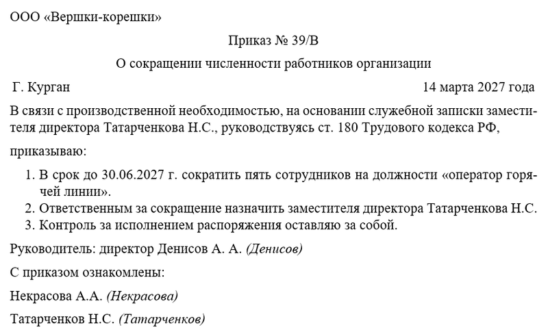 Скачать в КонсультантПлюсБесплатный доступ к документуОбразец приказа о сокращении численности работников организации