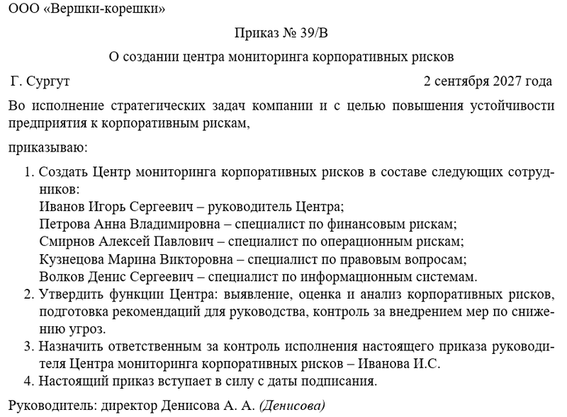 Приказ о создании центра мониторинга корпоративных рисков оформляется на фирменном бланке организации с указанием реквизитов, даты и номера. Во вводной части отражаются основания для создания центра, цели и стратегические задачи. В основной части перечисляются функции центра, его состав, распределение ответственности, методики работы, сроки исполнения и формы отчетности.