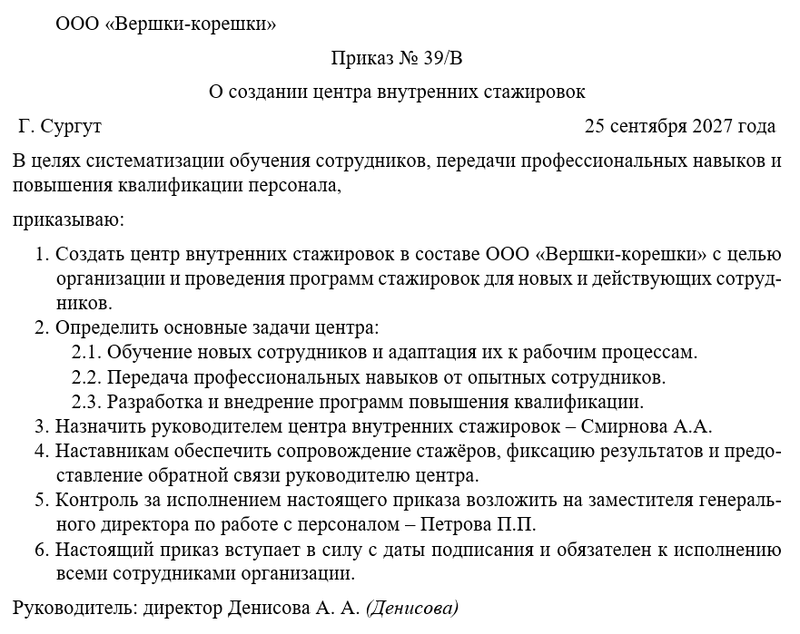 Приказ о создании центра внутренних стажировок должен содержать ключевые положения, которые обеспечат его эффективное функционирование. В тексте документа необходимо закрепить: