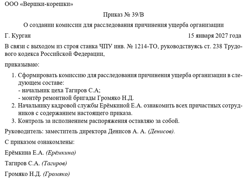 - создать комиссию для расследования причинения ущерба комиссии, перечислив, как минимум, два её участника;