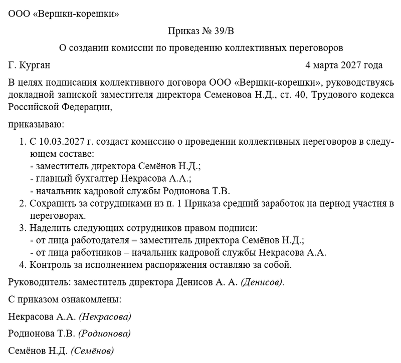 - с такого-то числа создать на предприятии комиссию по проведению переговоров в таком-то составе;