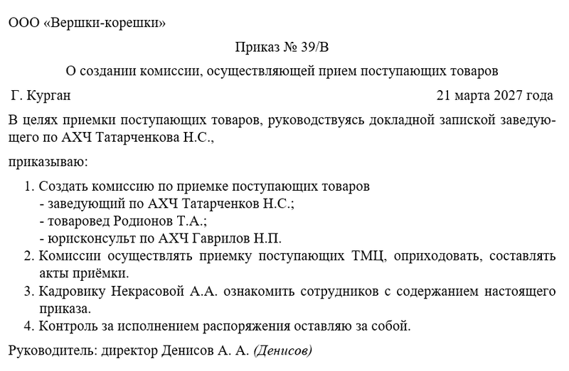 Состав комиссии утверждается приказом директора, в котором также указываются их полномочия и порядок работы. Например, комиссия может быть создана на постоянной основе (для регулярных поставок) или временно (для разовой приемки крупной партии товаров).