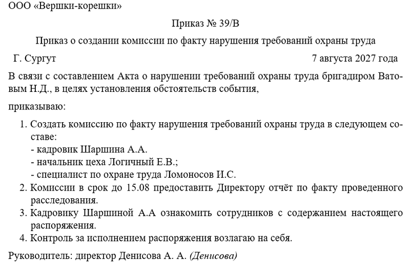 - Создать комиссию по расследованию факта нарушения требований охраны труда работником [ФИО, должность] при выполнении работ [Кратко указать вид работ/место] в следующем составе: