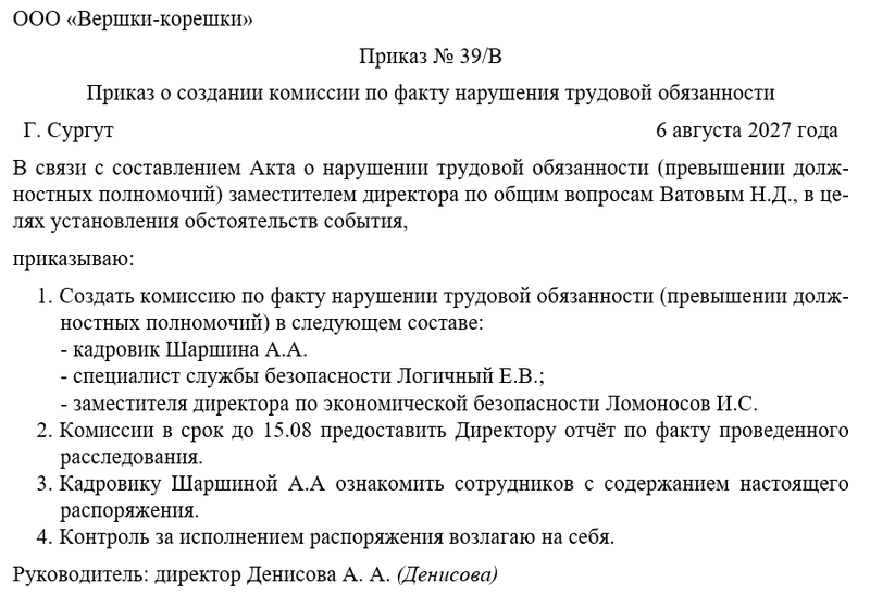 - Создать комиссию по расследованию факта нарушения трудовых обязанностей работником [ФИО, должность] в следующем составе: