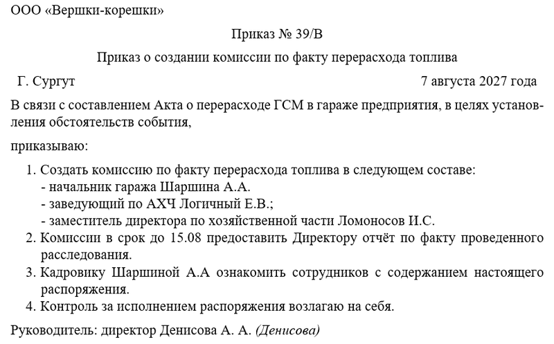 Приказ руководителя является единственным правовым основанием для начала служебного расследования факта перерасхода топлива. Он наделяет комиссию полномочиями требовать документы, проводить опросы и осмотры техники. Без этого приказа выводы комиссии и ее акт не будут иметь юридической силы.